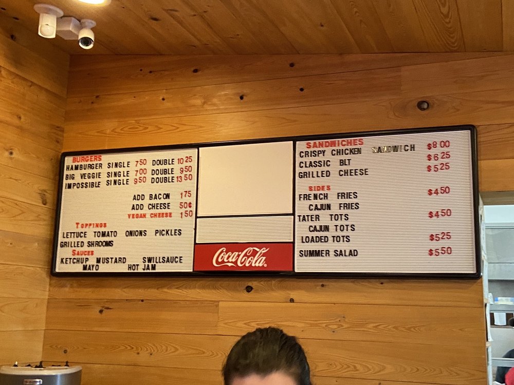 Our house veggie burger, composed of beets, black beans, brown rice, and golden raisins / Di Paolo's bun / 1/4 Lb. per patty.